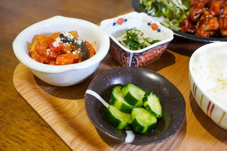 主菜のヤンニョムチキンとトマトのサラダ、ご飯に野菜の副菜が3皿、そして汁ものとボリュームたっぷりです。
