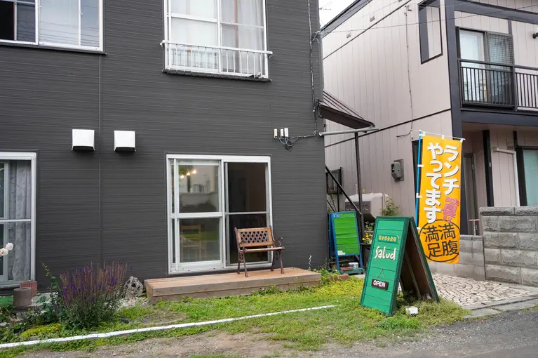 「西岡3条11丁目」のバス停から徒歩2分ほどの場所にある隠れ家的な定食屋さんが「裏方家食堂部 salud(サルー)」。