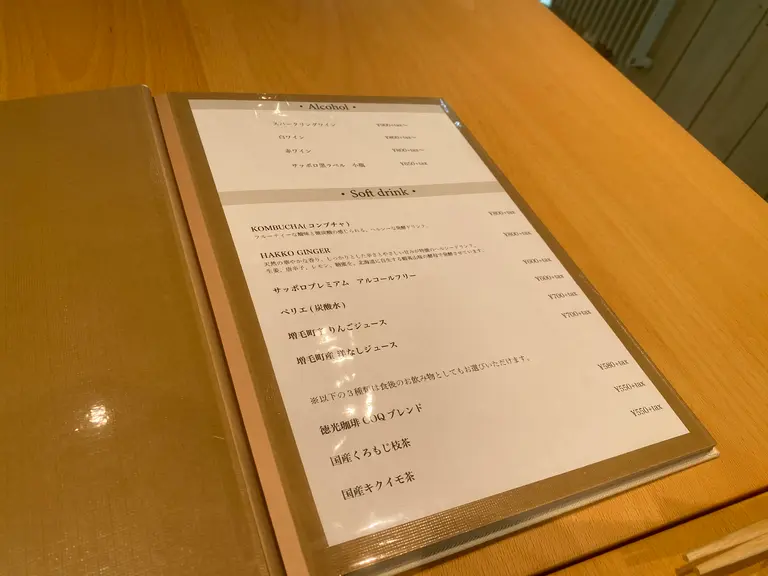 席に着くとお品書きが。素材の名前しか書かれていないので、どんな料理が出てくるのか、ワクワクがとまりません( ˘ω˘ )