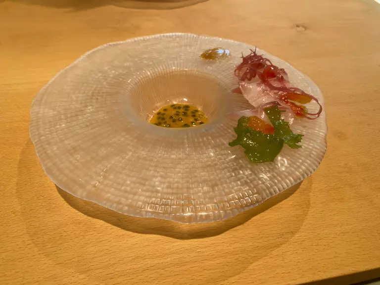 奥に少し乗っているのはイタリアの魚醤「ガルム」というもので、塩気と旨味が強いです。ほんのちょっとつけるだけでOK!白身の甘みがぐっと引き立つ!