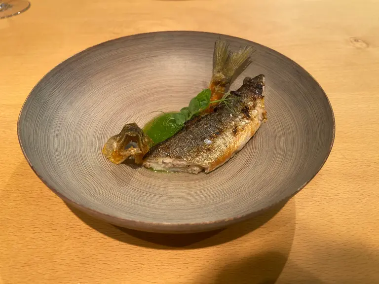 ふっくらふわふわに焼かれた鮎は絶品…!胡瓜のソースも合います!多分、柑橘系も入っているのかさっぱりとしていました!