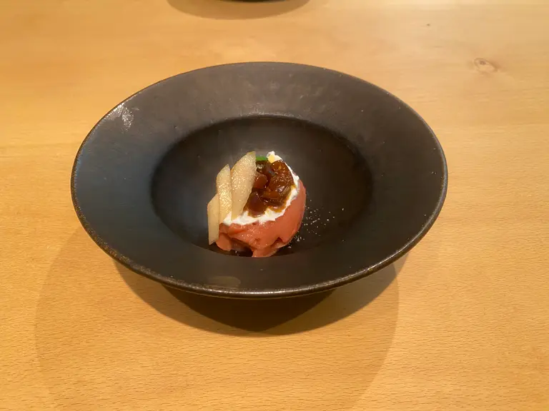トマトのジェラート、おそらく水切りヨーグルトのクリーム、茄子のキャラメリゼ、桃とハーブです。
