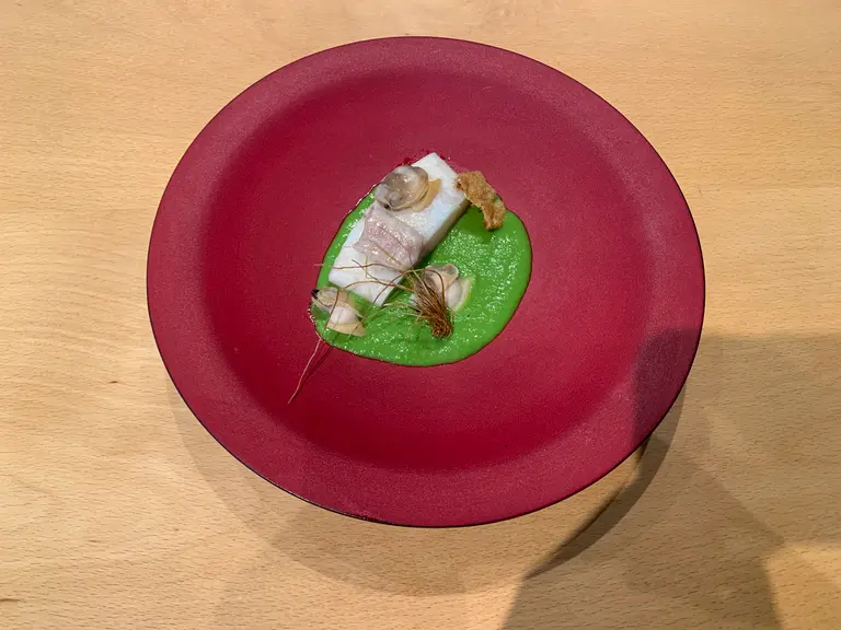 九条ネギのピューレは色鮮やかな緑色で赤い器と相まって綺麗なビジュアルしていますよね(*’ω’*)甘みもあって白身魚とも相性ばっちりです!