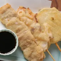 なんと卵を使用せず、長芋と牛乳を使用してパン粉も粉末状にしている豚串、タコ串、玉ネギ串揚げのセットです。居酒屋の気分を外で味わえるのはうれしいですね!