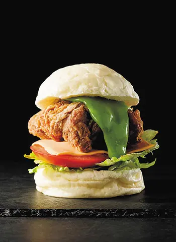 白色の珍しいこのバーガーはオータムフェスの限定商品!北海道のソウルフードであるザンギと新鮮野菜をまとめ上げるのは宇治のチーズフォンデュソース!見た目のボリュームも満点で満足すること間違いなし!