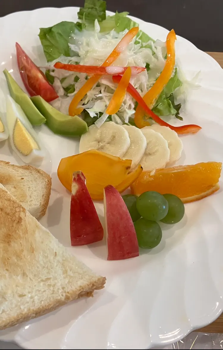トースト、ウィンナー、ゆで卵、サラダ、フルーツのワンプレートにヨーグルト、スープとホットコーヒーが付いて破格の300円!!