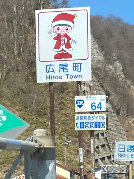 いよいよ広尾町のカントリーサインが見えて来ました。専務が使っている赤いネックウォーマーで赤い帽子に見せる作戦で体現成功!