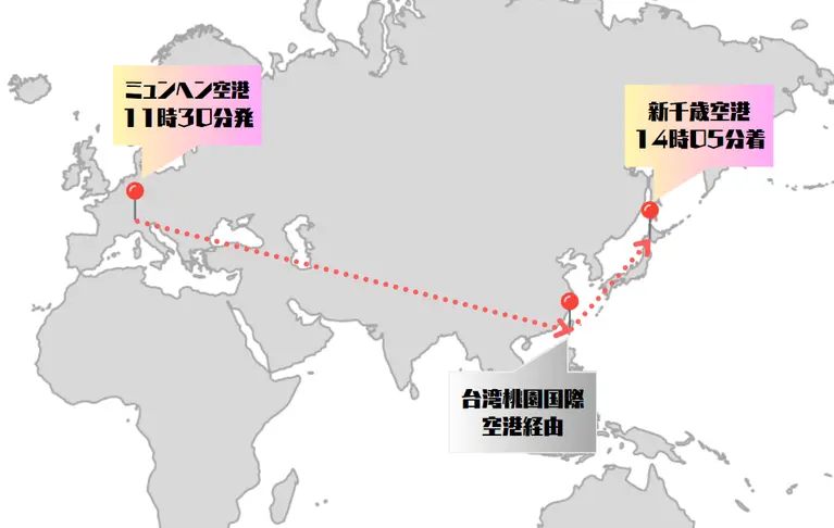 →新千歳空港 14時05分着(ミュンヘン出発の翌日)