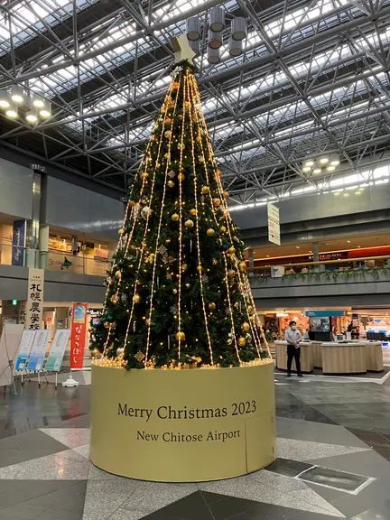 金色に彩られた豪華なツリーの前で写真を撮る人が多く見られ、搭乗を待つ人や北海道に降り立った観光客らを楽しませてくれています。