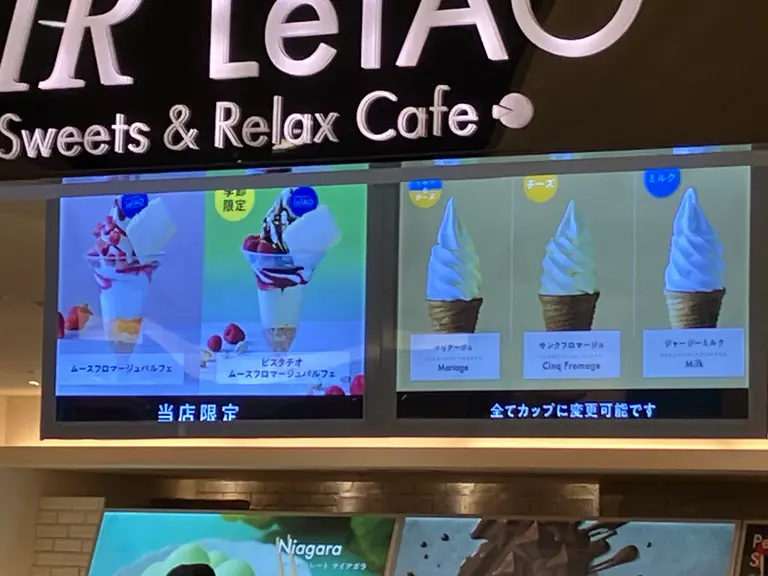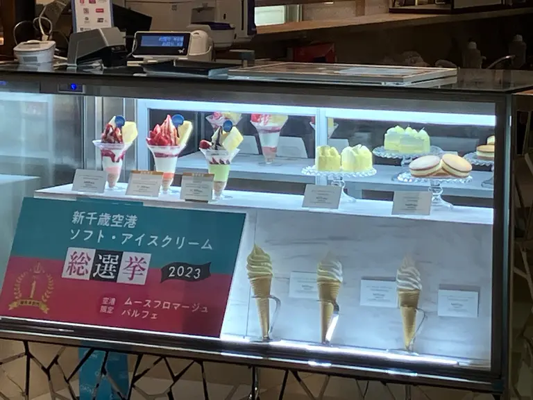 新千歳空港店では、ソフトクリームやムースフロマージュパルフェ(パフェ)も販売。
