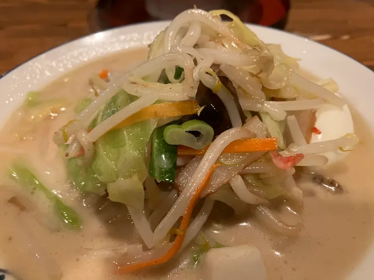 濃厚でクリーミーな豚骨魚介スープに丸太麺、山盛りの炒め野菜。