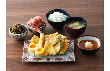 九州ならではの食材を使用した揚げたての天ぷらが自慢のお店。なんと、やまやの明太子やからし高菜、ご飯はお替り自由とのこと!これは嬉しいですね。揚げたての天ぷらを1品1品、数回に分けて提供いただくスタイル。天つゆのベースとなる出汁は6種類の国産のだし素材を配合した、コクのあるオリジナルの天つゆがまた美味。やまやの天ぷら衣は軽さが特徴なので、サクサクでもたれにくい綿実油とコーン油を独自に配合したこだわりの油を使用しているので、胃もたれがしやすい方にもおすすめです。