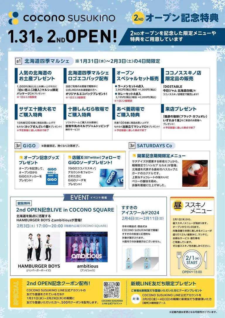 COCONO SUSUKINOでは、2ndオープンを記念して様々な特典やイベントがもりだくさん!この機会にCOCONOでおいしい体験をしちゃいましょう!