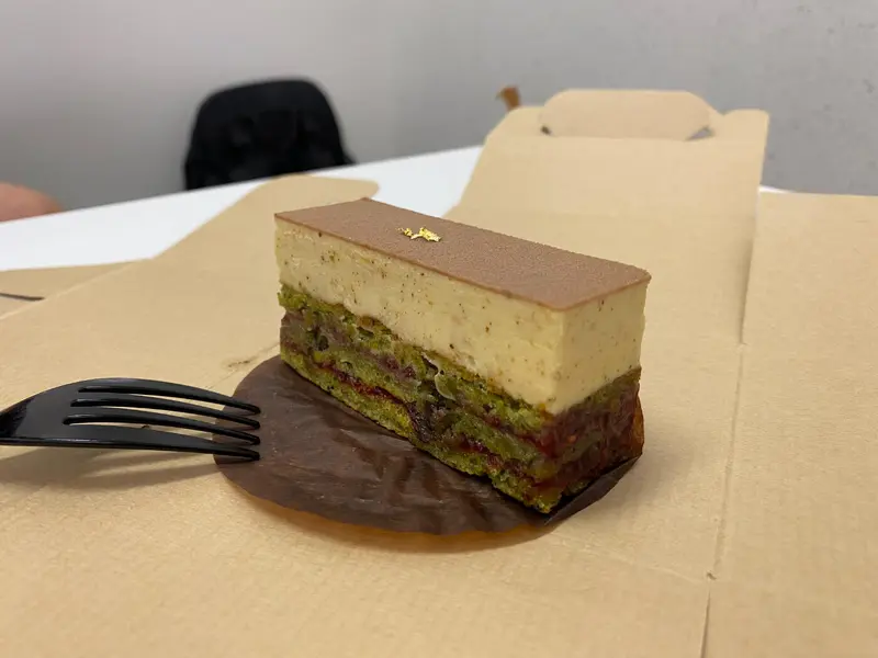 そして下がピスタチオのマカロン生地、間にフランボワーズジャムがサンドされています。