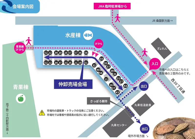 札幌市中央卸売市場には「水産物部」と「青果部」があり、市場内も水産棟と青果棟で分かれています。