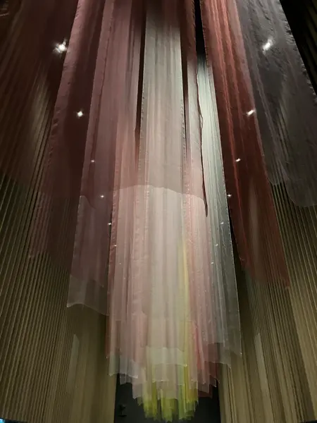 日本古来の染色技法「植物染め」の巨大な絹布が連なる作品で、北海道の四季を表現しています。