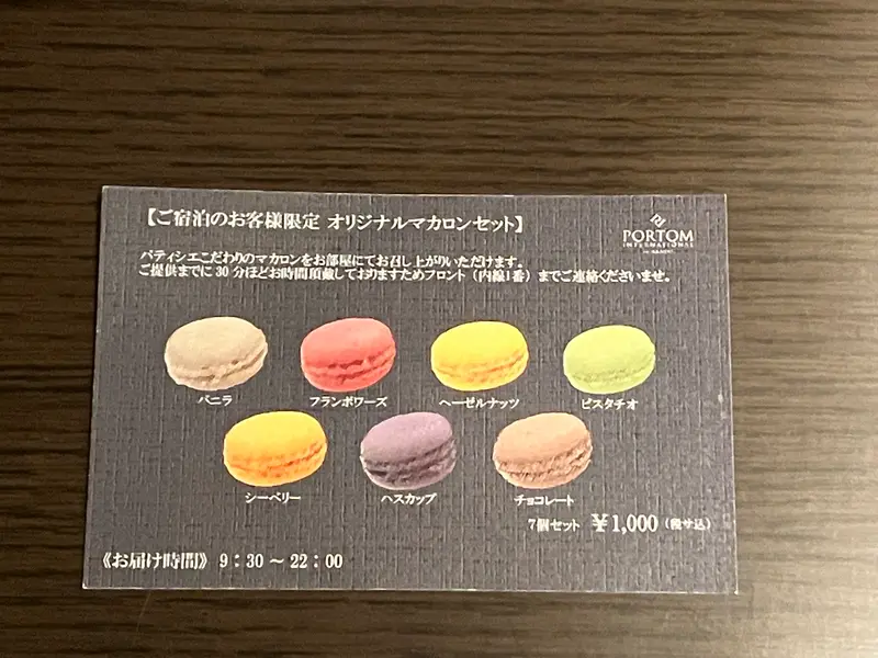 【ご宿泊のお客様限定 オリジナルマカロンセット】は、フロントに電話でお願いするとお部屋まで持って来てくれます。