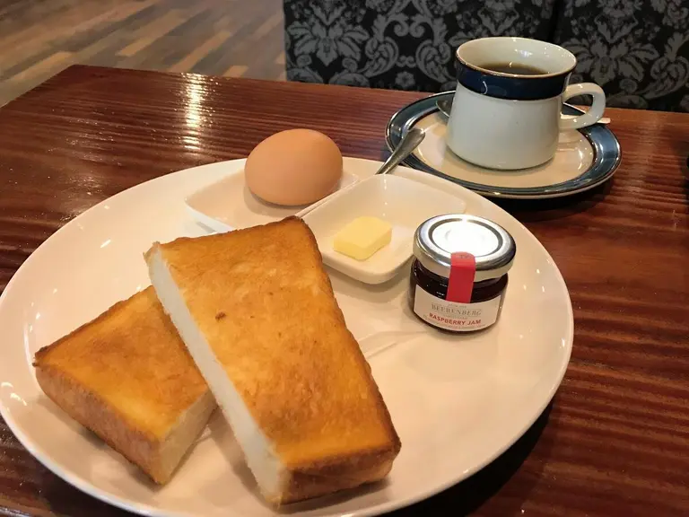 コーヒー・厚切りトースト・選べるジャム・四つ葉バター・かっぱの健卵ゆで卵がセット。