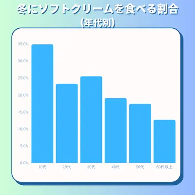 年代別に見ると、若い年代ほど冬でもソフトクリームを食べる割合が高く、10代では34.9%が食べると回答しています。