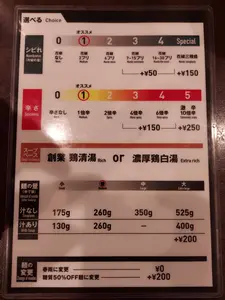 担々麺はシビれ(0~4、Special)、辛さ(0~5)、スープベース(創業鶏清湯or濃厚鶏白湯)、麺の量(小~大)が自由に選べます。