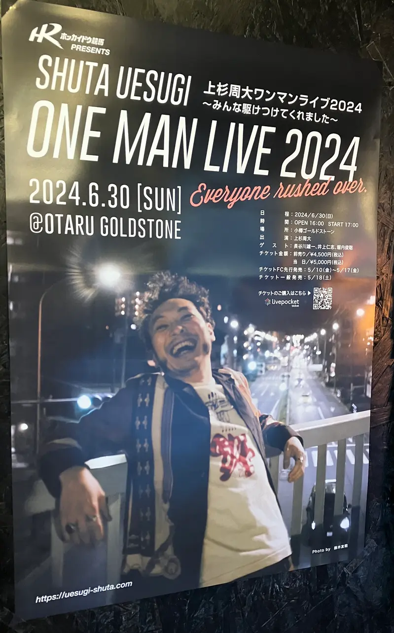 6月30日に小樽ゴールドストーンで開催された【ホッカイドウ競馬PRESENTS「上杉周大 ワンマンライブ 2024 〜みんな駆けつけてくれました〜】のポスター。