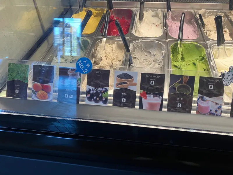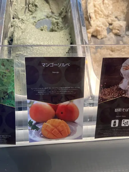 左から よもぎ、マンゴーソルベ、韃靼そば、カシス、黒ごま、ストロベリーミルク、抹茶、ブルーベリーヨーグルト
