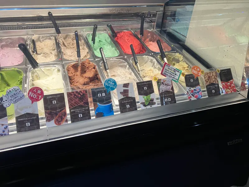左から 美瑛町のフレッシュミルク、自家製ラムレーズン、濃厚カカオとチョコチップのダブルショコラ、エスプレッソクッキー、ガリガリチョコチップ、ペパーミントチョコチップ、カッサータ シチリアーナ、ベリーベリーベリー、シチリア島ブロンテ村産ピスタチオ、いちごソルベ