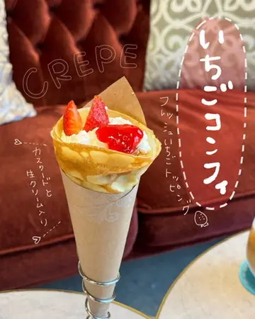 いちごのコンフィが入ったクレープで、写真はフレッシュイチゴをトッピングしています。