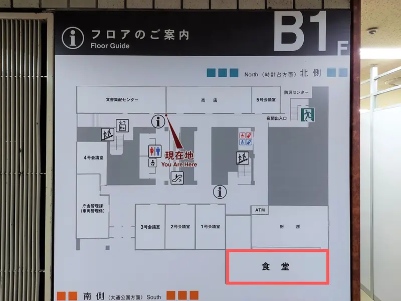 地下食堂には、市役所に入り、中央のエスカレータから降りるか2か所ある階段からB1Fに降りると南東側にあります。正面玄関からの最短ルートは、入ってエスカレータ右にある階段。降りるとすぐ食堂に着きます。