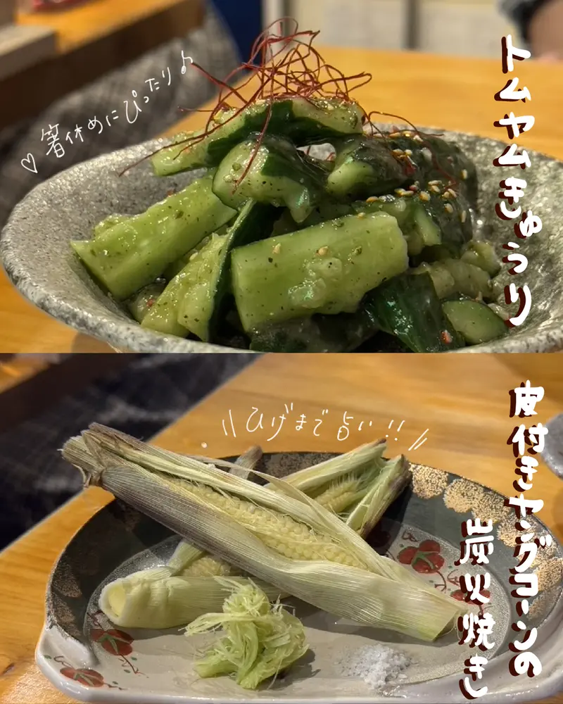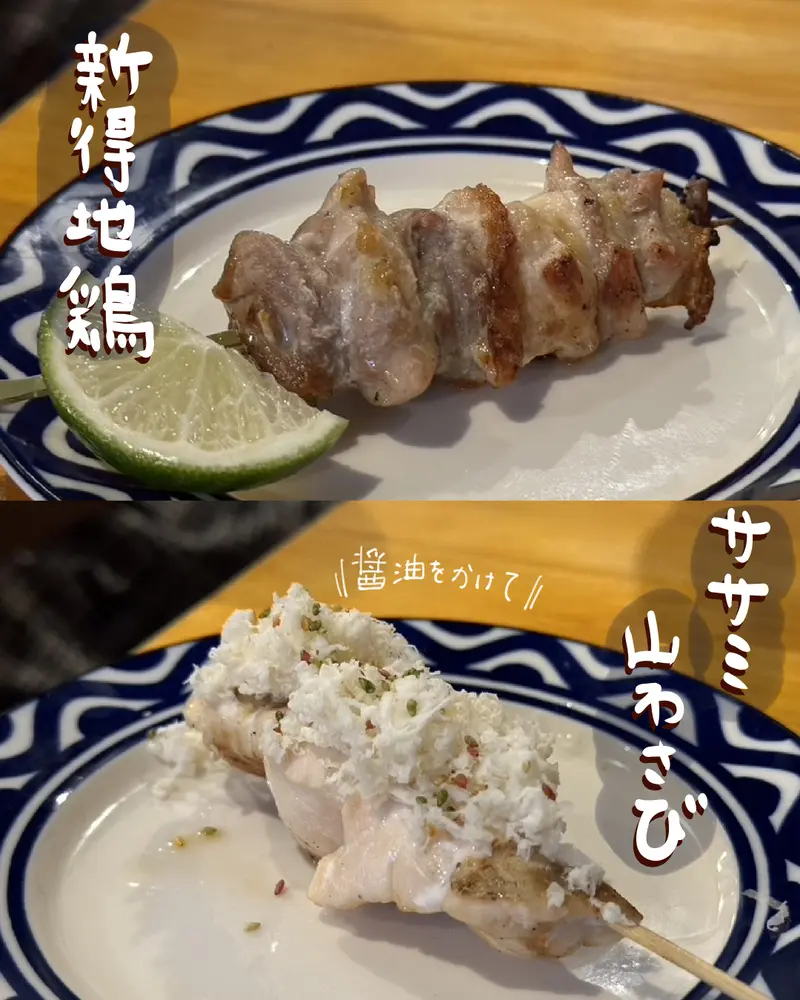 地鶏は旨みが詰まった美味しいお肉、ササミ山わさびにはしょうゆを垂らしてさっぱりいただけます♪
