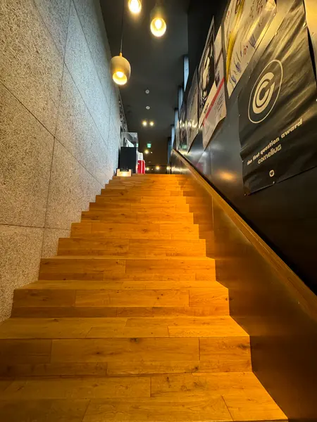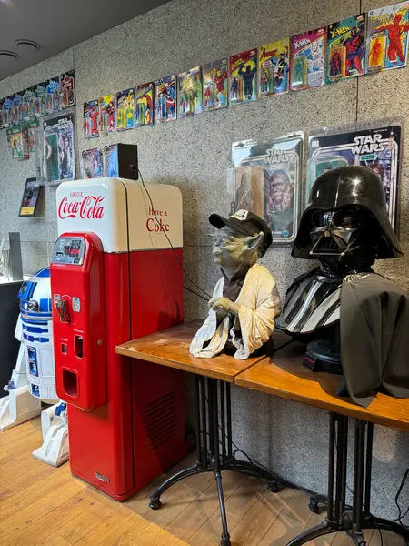 1階はお洒落なカフェで、映画を思い出させるようなものが点在していますが、入り口入ってカフェとは反対側の通路に行くと階段があります。
