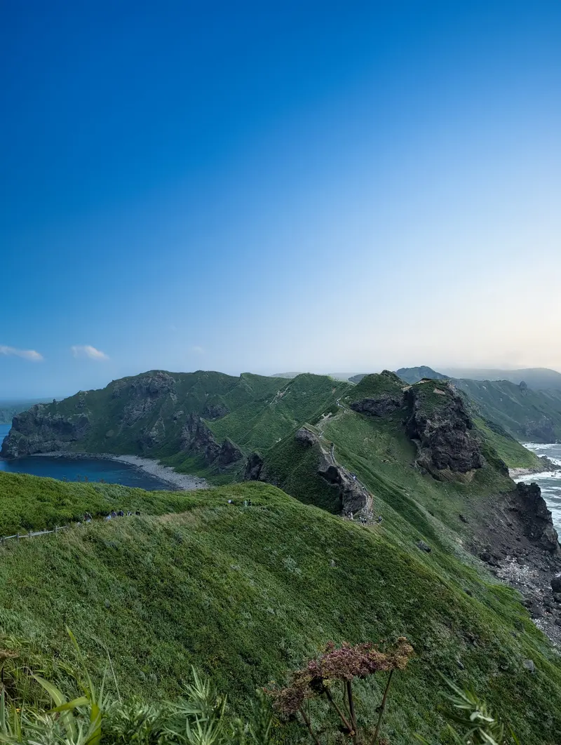 神威岬は、その名の通り「積丹ブルー」を満喫できるスポット。深い青色の海と白い岩のコントラストは、まさに息を呑む美しさです。澄んだ空気と爽やかな風が心地よく、自然の大パノラマを楽しめます。