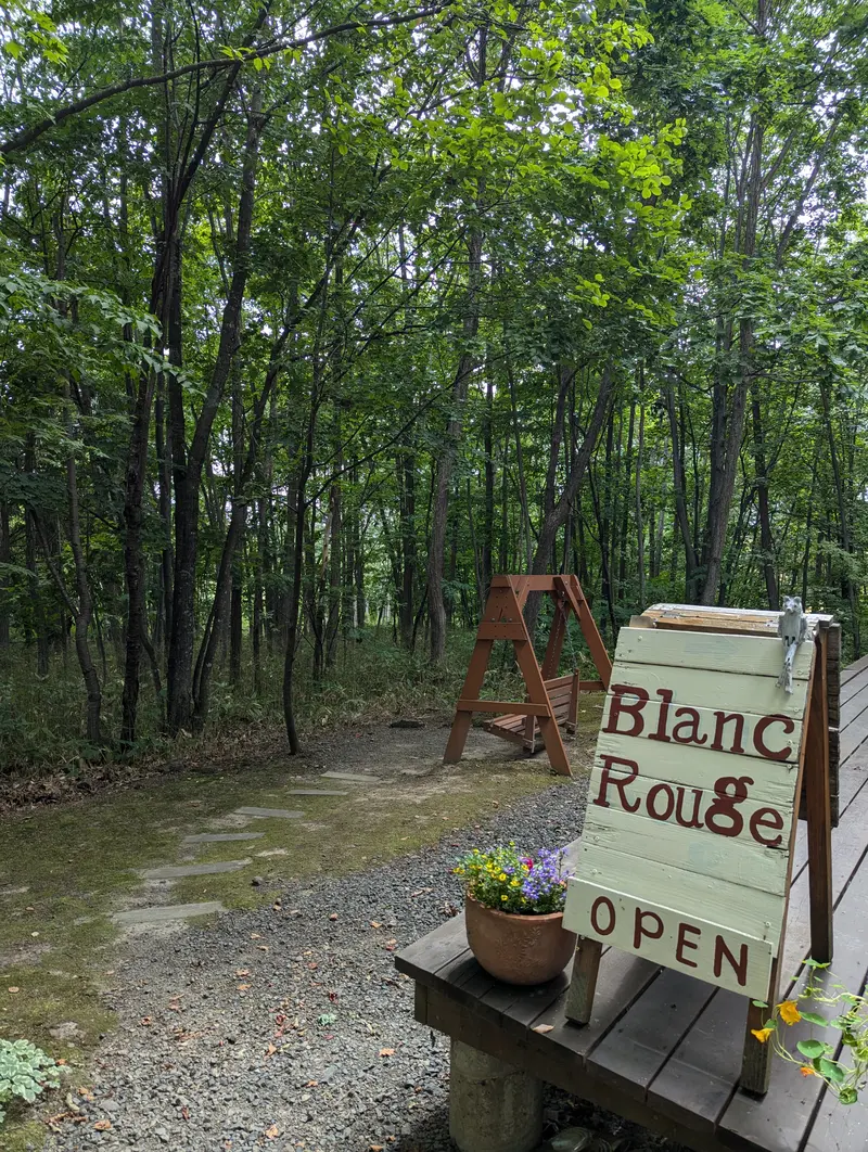「フェルム ラ・テール美瑛本店」から車で2分。森の中にたたずむ隠れ家レストラン「ブラン・ルージュ」に到着。駐車場に車を停めて雑木林の中を進むとログハウスが見えてくる。自然に囲まれたここはもう別世界。テラス席に座ると虫の声しか聞こえません(笑)