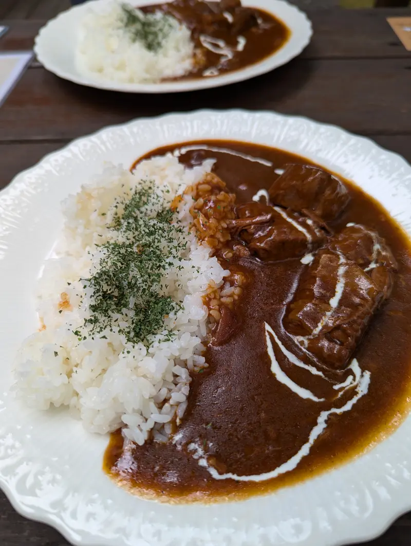 牛肉と香味野菜を赤ワインで長時間煮込み、デミグラスソースを加えコクのある一品に。ライスは美瑛産ななつぼし、パンは美瑛産小麦を使用した自家製パンでした。自然あふれる中で最高のランチを味わう贅沢な時間。