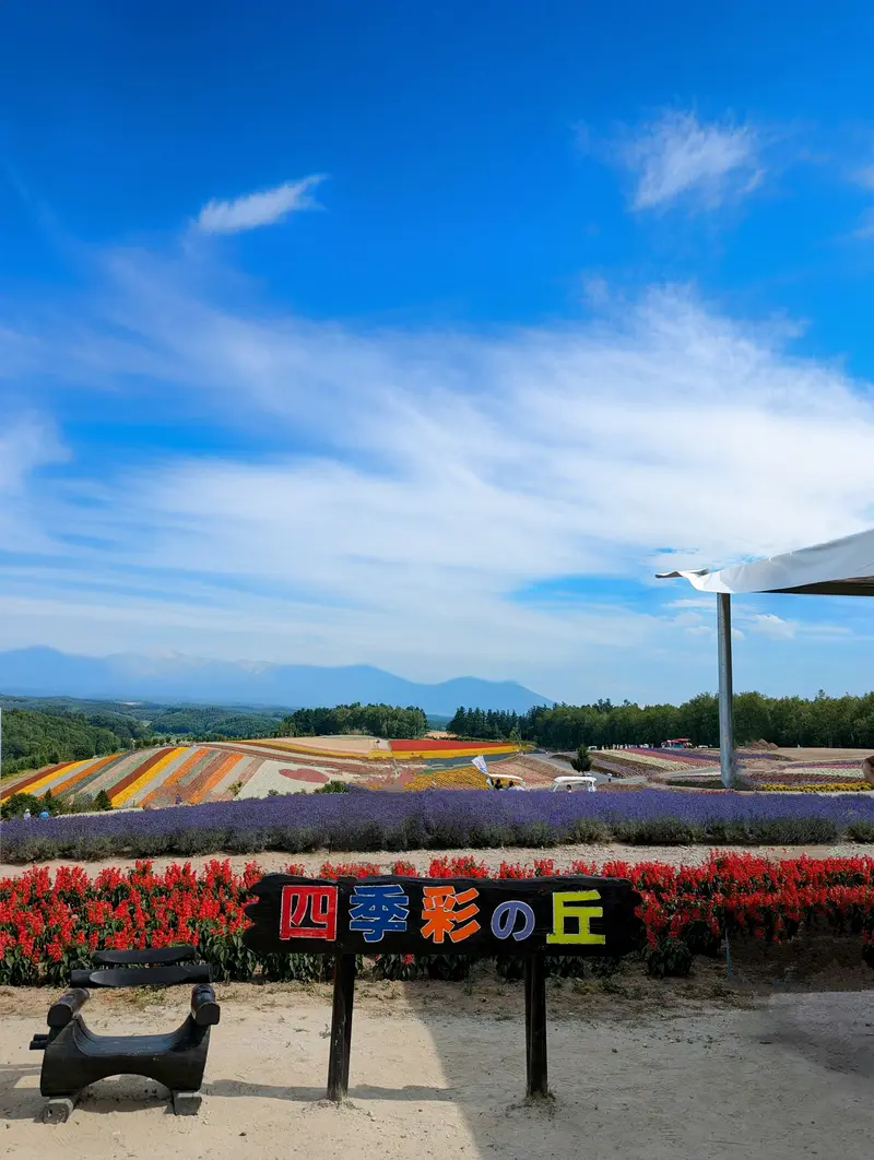 「ブラン・ルージュ」から車で約15分。夏は広大な花畑、冬はスノーモービルなど北海道らしい体験ができる美瑛を象徴するエンターテイメント・ガーデン「四季彩の丘」に到着。