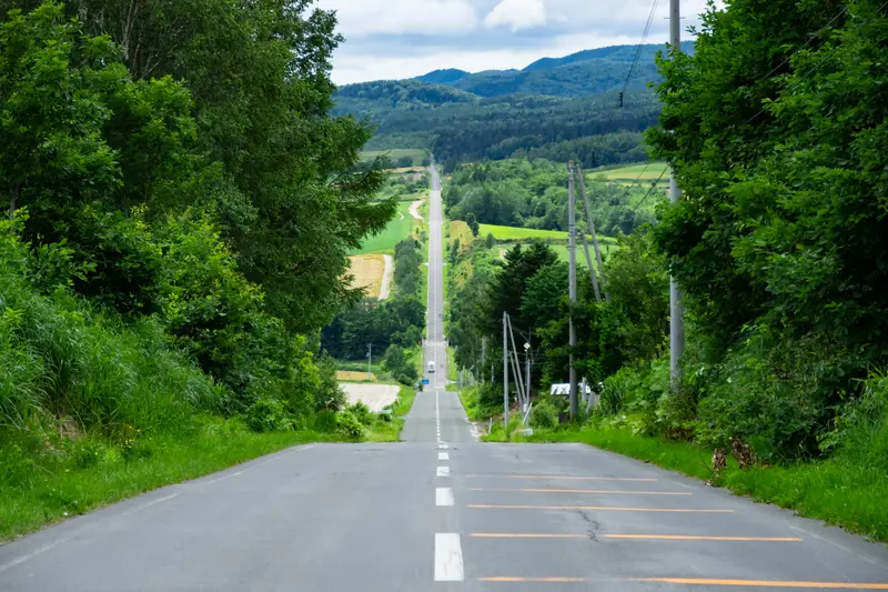 「四季彩の丘」から車で約10分。国道237号線沿いにある標識「西11線農免農道」を目印に曲がると、そこから高低差の激しい直線道路が2.5kmに渡り続きます。道沿いに田園や丘陵地が広がり、登るにしたがい十勝連峰が見えてくる絶景スポットです。