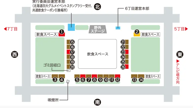 各会場の情報を発信するエントランスとなる4丁目会場。ここでは北海道の定番メニューをはじめ、北海道産の肉、新鮮な魚介類、シメスイーツまでバラエティ豊かなお店が軒を連ねます。もちろん、北海道(特に札幌)グルメの顔ともいえる『ラーメン』も出店します。
