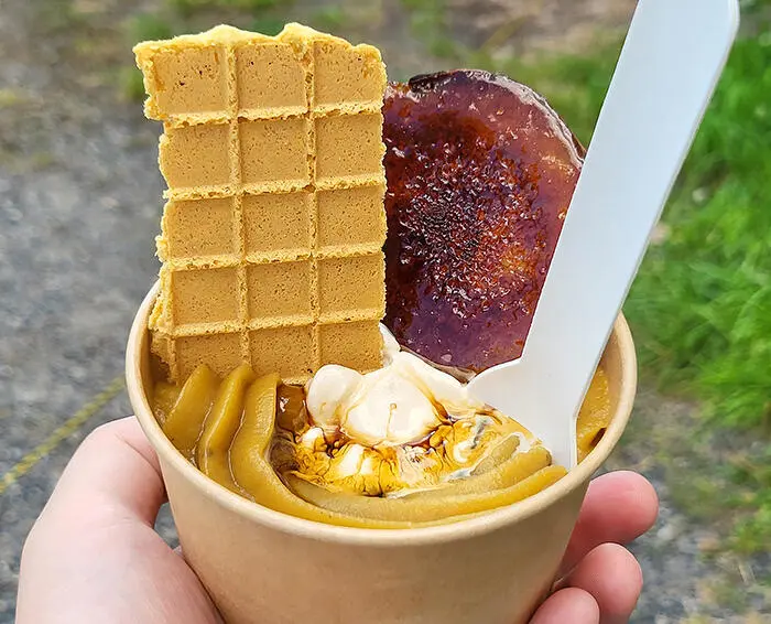 ブリュレされてカリッとした食感の焼き芋も、甘くてソフトクリームと一緒に食べるとより美味しい♪