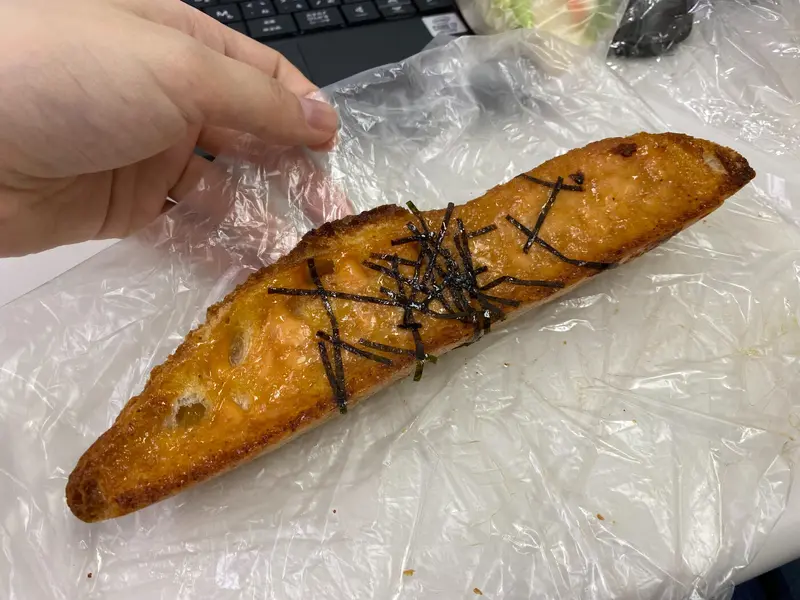 ハードなフランスパンに結構辛めな明太子のソースがじゅわっとしみ込んでいて最高です!