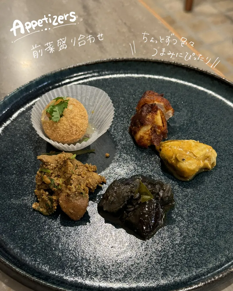 こちらはいろんなメニューが一口ずつ載った前菜盛り合わせ。