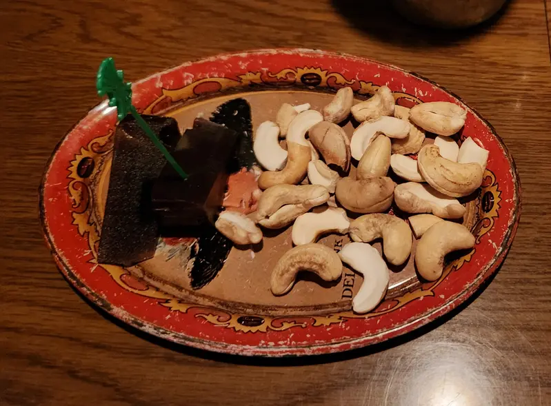 お通しは羊羹とナッツ。モルトとのマリアージュを追及した結果、栗羊羹が最適解だったそう。ピーティーさ・ウッディさはもちろん、モルトの甘みを引き立ててくれる。栗が入ることで、奥ゆかしさが段違いに広がっていく・・・。