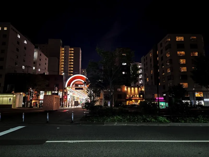 ふと振り返ると夜の色も深くなり、創成川の向こう岸を見渡すと異世界にいるような気分に。