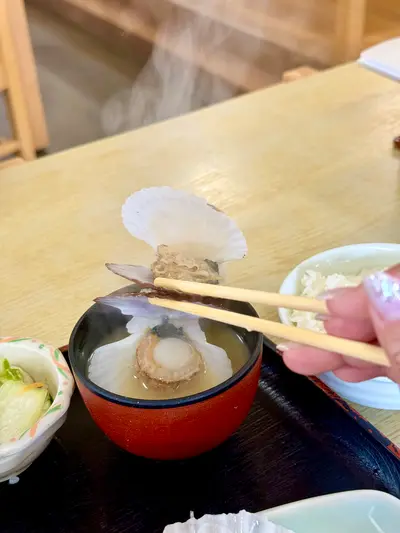 定食でついてくるお味噌汁には帆立の稚貝が入っててこれまた美味^^