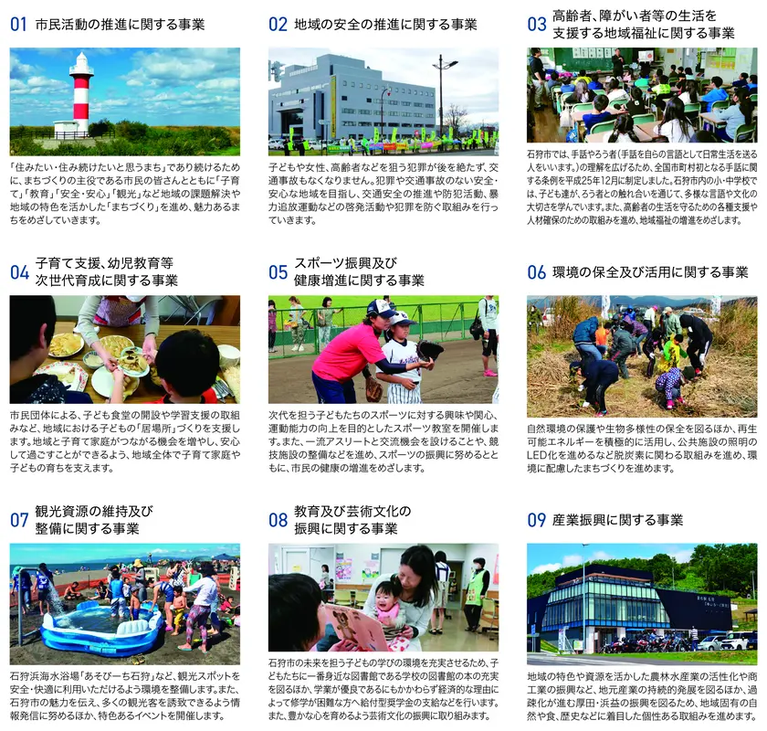 石狩市では、皆様から寄せられた寄附金は使いみちを指定しない“市長におまかせ”を除き、寄附者の意向を反映できるよう9つの使いみちから選択することができます。いただいた寄附金は、一度「石狩市ふるさと応援基金」に積み立てし、寄附を受けた翌年度以降に実施する事業に活用させていただきます。