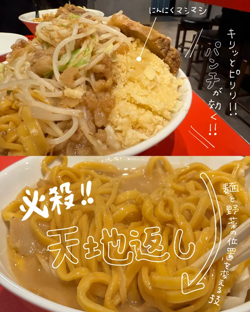 麺をしたから上にぐるっと持ち上げてひっくり返すことを、二郎系の用語で天地返しというようです。
