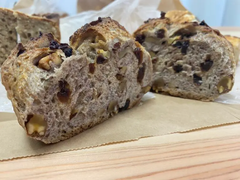 カンパーニュ生地にラム酒漬けのレーズンとカレンズ(小粒のブドウ品種から作られ、レーズンよりも酸味が強い)が入っています!