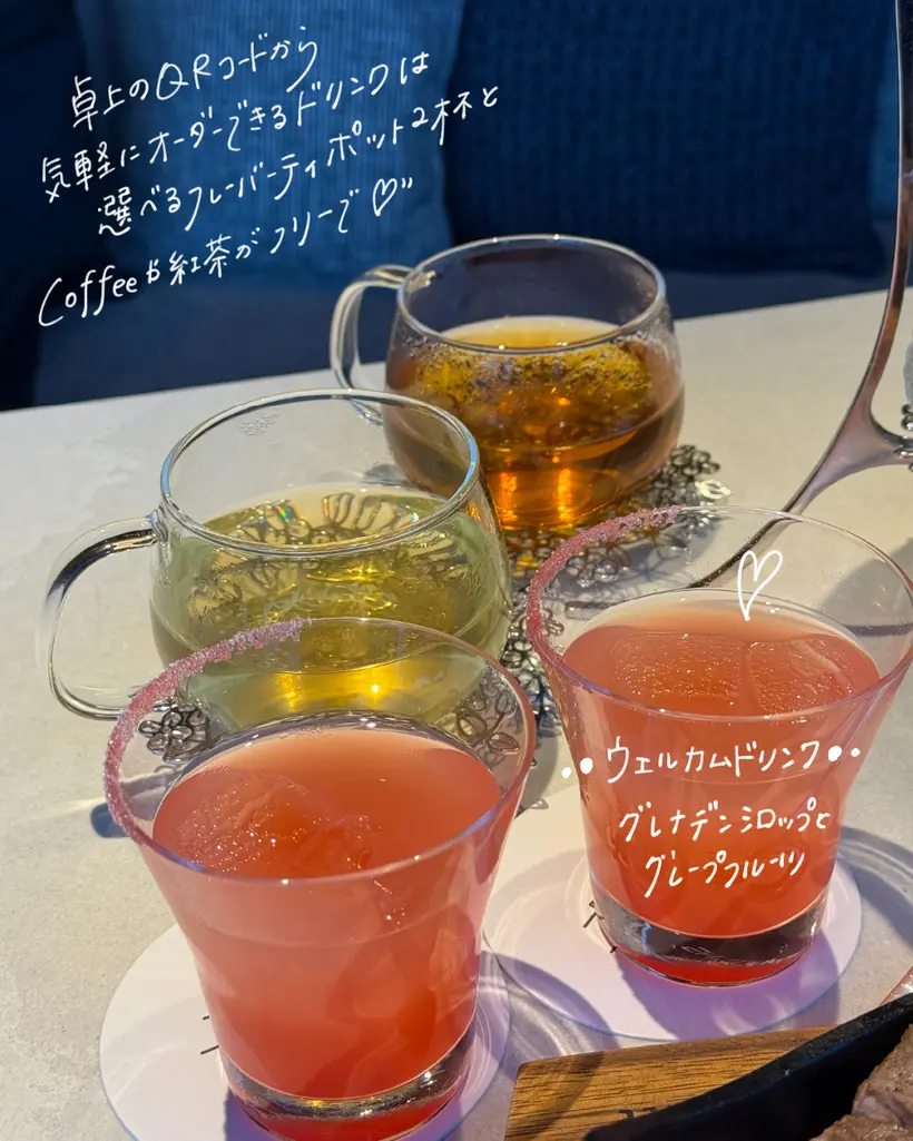 ドリンクも選べるティー2杯と、フリーでコーヒーや紅茶がQRコード読み取りで携帯から気軽にオーダーできます☕️