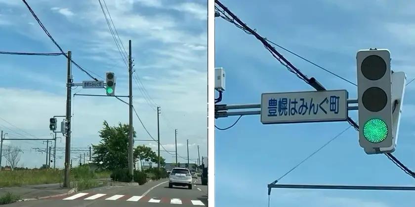 しばし歩いた先の信号(ココ)に書かれた地名「豊幌はみんぐ町」を見つけ会話が盛り上がる。