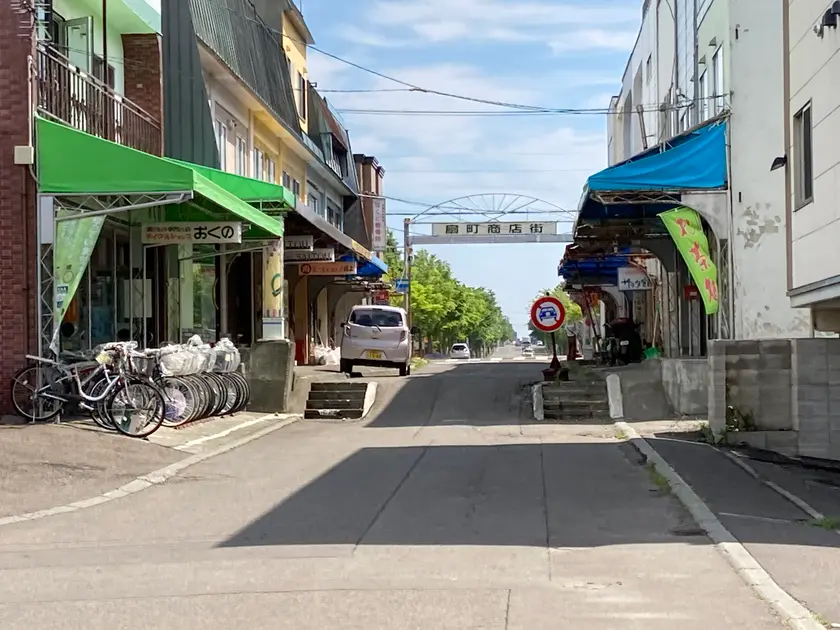 カントリーサインから江別市に入ったブギ一行。見えてきた扇町商店街で足を止めます。