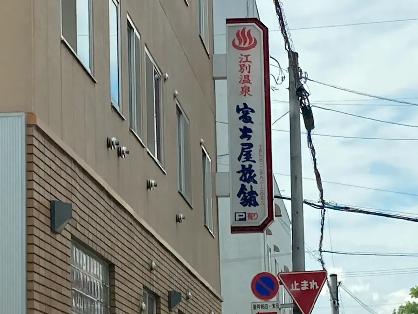 侘び寂び重視の「ブギウギ奥の細道お宿ルール」に基づき宿探し。情報収集のために駅に向かうと、江別駅近くに温泉マークを付けたお宿を発見!専務の交渉が成功「マルー!○」良かったネ(^^)